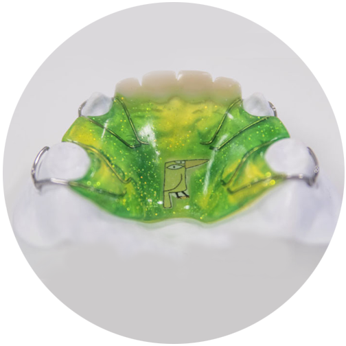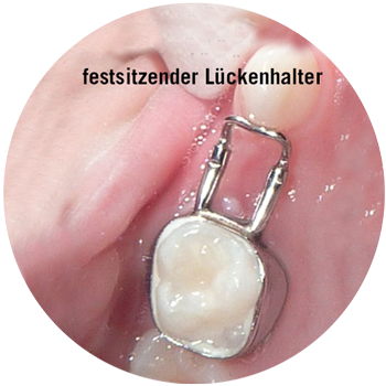 Manchmal läßt es sich nicht vermeiden, einen Zahn zu ziehen, etwa wenn er eine Fistel oder Schwellung hat. Ein „Aufbohren und offen lassen“ ist keine saubere Lösung. Damit die Lücke sich nicht verengt und der Platz für den bleibenden Nachfolger verloren geht, wird ein Lückenhalter eingesetzt. Diese gibt es herausnehmbar(↓ Bild) – wie eine kleine Zahnspange – oder fest eingeklebt (↓ Bild).